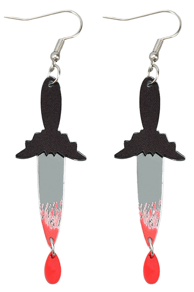 So stabby! A dagger with a black-bat shaped handle layered acrylic dangle earrings in black and mirror silver with matte red dripping blood!