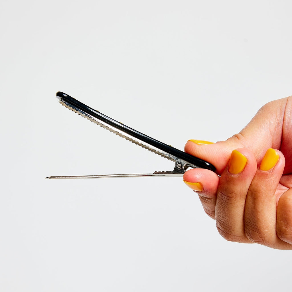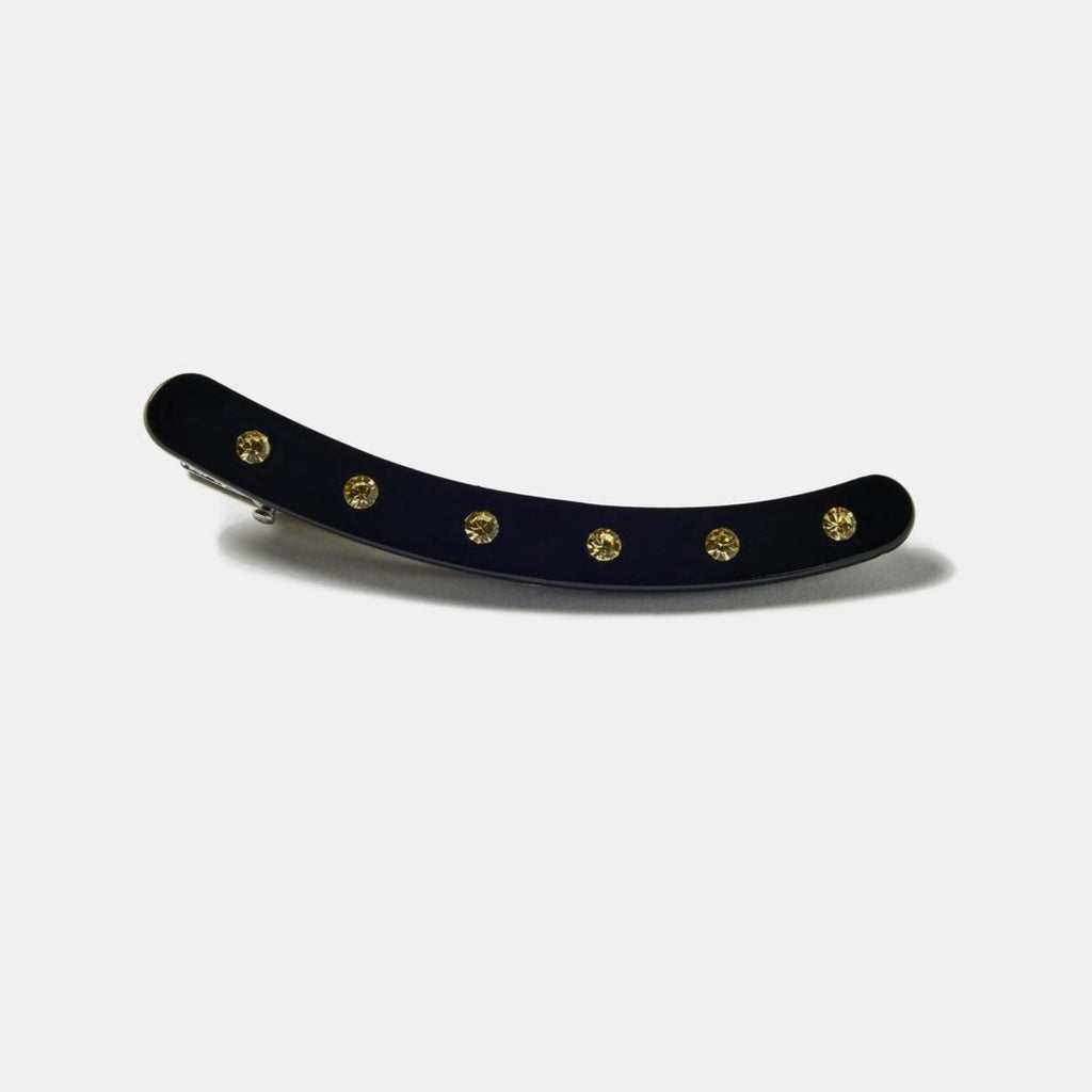 A beautiful curved alligator style hair clip in black acetate embellished with a row of golden rhinestones to tame your 'do in style. Made by Chunks.