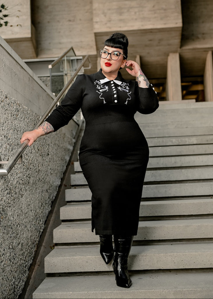 The Art of Temptation sweater dress is a vintage-inspired femme fatale fit worthy of any deadly dame! Made of soft and stretchy medium weight knit acrylic (think your favorite cardigan) to hug your curves and give you structure in all the right places, it features a black and white double layered collar, white buttoned bodice, a ribbed waistband, elbow length sleeves with ribbed cuffs and matching white buttons, and original illustrations by Larissa Pinup Art of a trio of classic Bad Gal symbols --a kitten heel, a coiled whip, and an opera-length gloved hand --embroidered in bright white across the bodice! It ends with a universally flattering pencil skirt with double side slit for ease of wear (and a little bit of va-va-voom, of course)! Pair with your favorite heels and some fishnets for a sultry look ripped from the pages of a pulp novel.