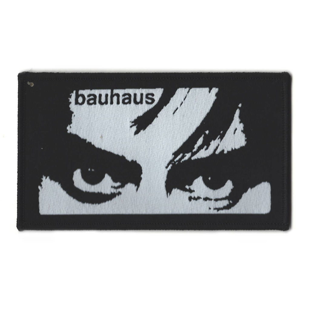 A woven patch with black stitched edges of the striking eyes of Bauhaus frontman Peter Murphy pictured in greyish white on a black background.
