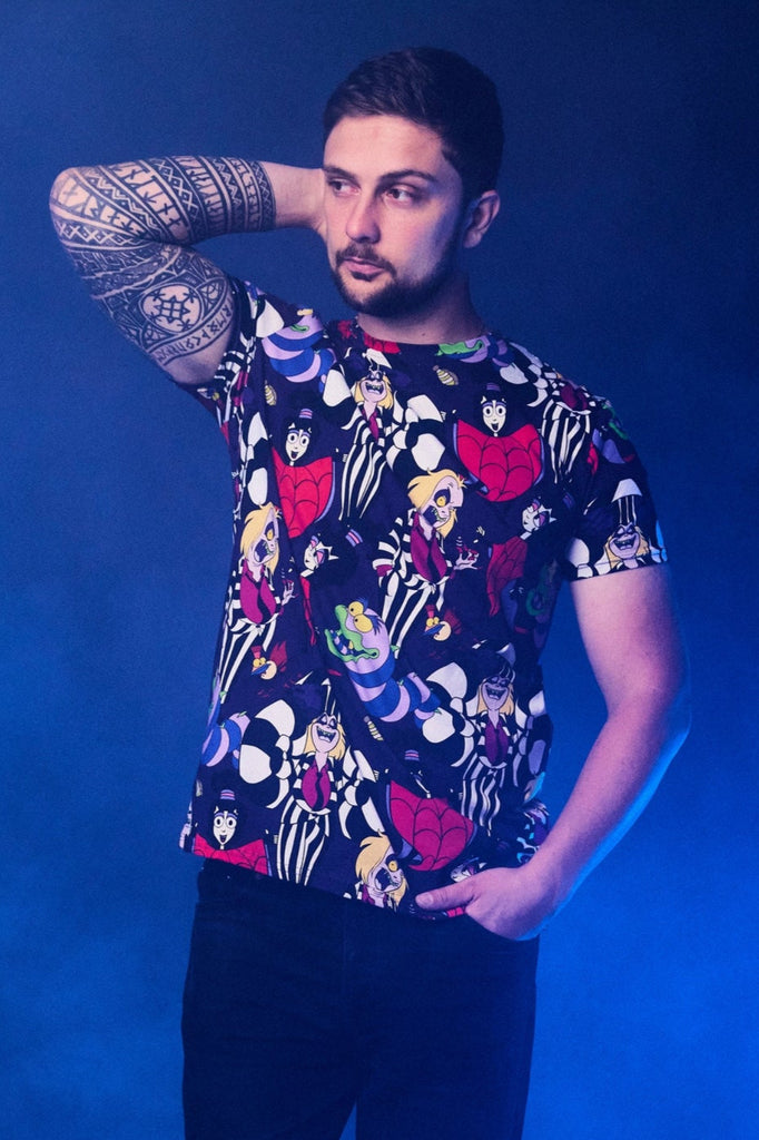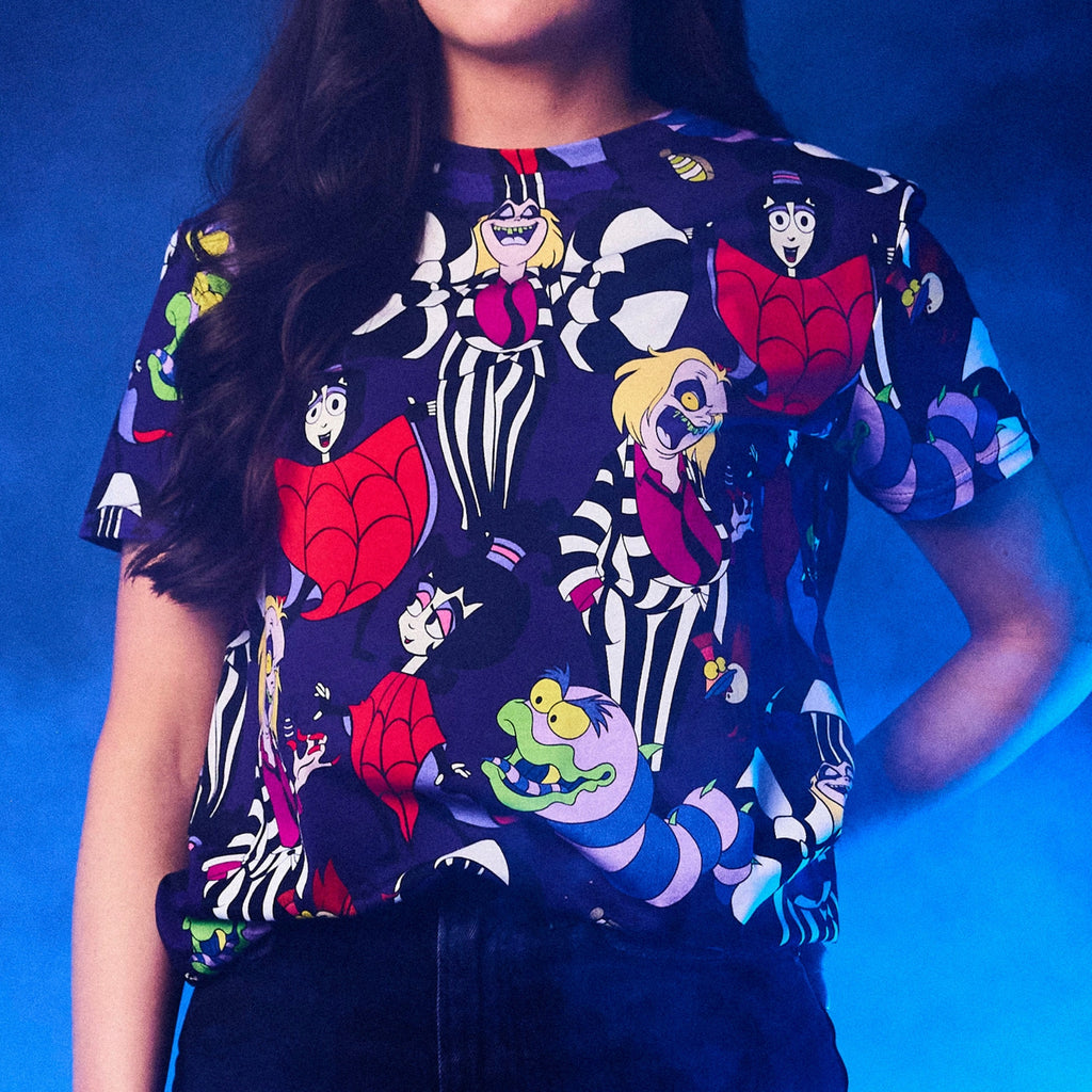 The perfect addition to the wardrobe of anyone who considers themselves the ghost with the most: this short sleeve cotton t-shirt printed with a purple background all-over colorful pattern of Beetlejuice, Lydia, and the Sandworm as seen in the 1989-1991 animated series loosely based on the movie! Made by Cakeworthy.