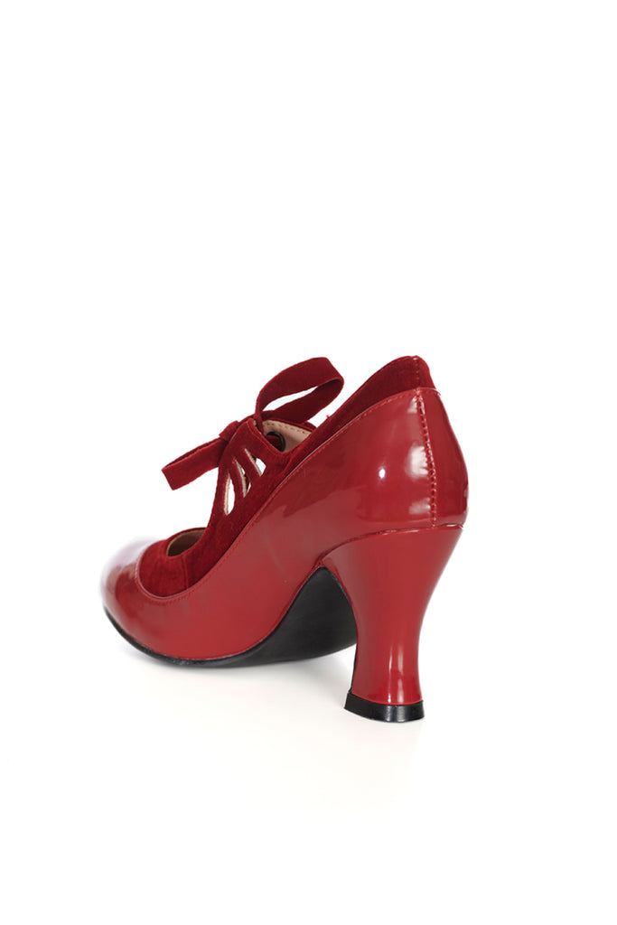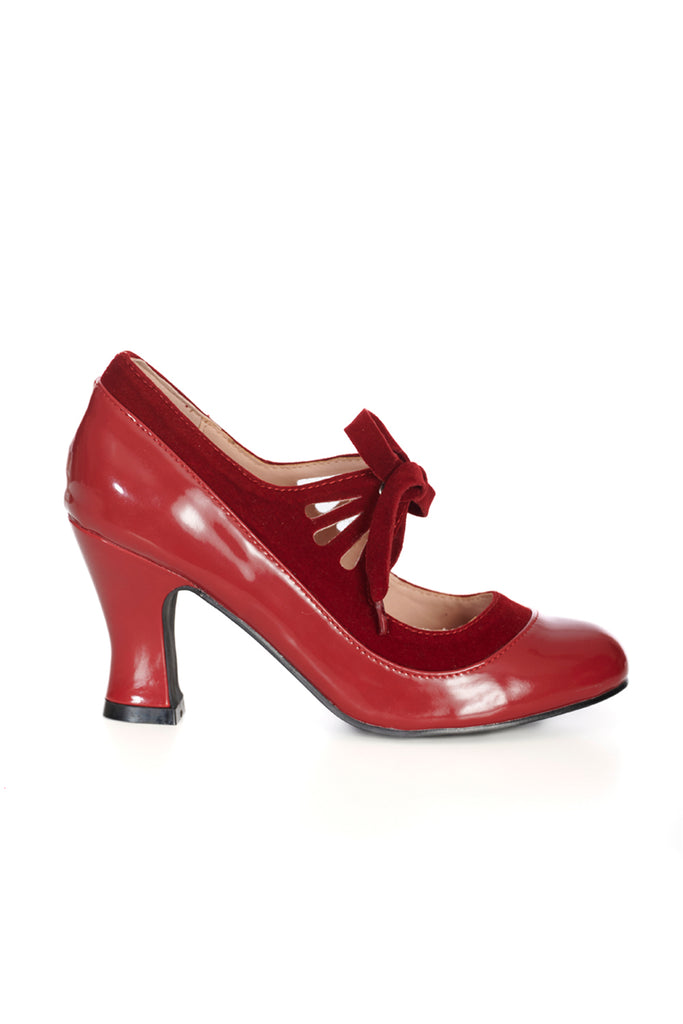Bertie Heels by Banned Apparel. This classic shape round-toed pearlescent finish* burgundy patent pump with 3" heel height features matching color velvet teardrop cutout detail straps across the instep fastened with soft velvet ribbon ties. It's a lovely and versatile shoe to pair with retro or modern outfits