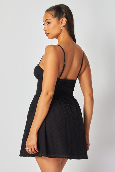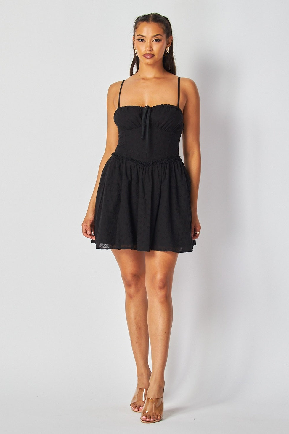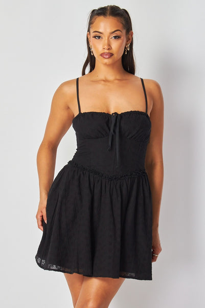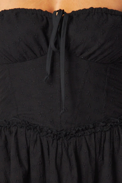 A piece that has all the beautiful details of vintage sundresses --but in a sassier, shorter length! In a sweet classic black floral eyelet patterned cotton, this dress has square neckline with adjustable spaghetti straps, ribbon tie detail, an under bust seam with boning along the bodice, elasticized smocking with a corset-style lace-up detail at the back, and a gathered above the knee skirt... The perfect barely-there piece for those long summer days!