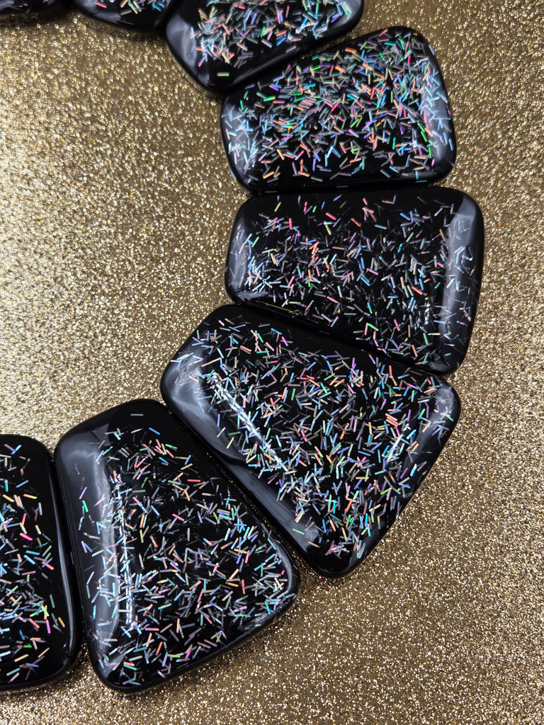 A bib necklace consisting of trapezoid-shaped sections of black resin (ranging from 1” x 1 1/2” to 2 1/4” x 2 3/4”) sprinkled with iridescent bar glitter that seems to sparkle as it catches the light --gorgeous!