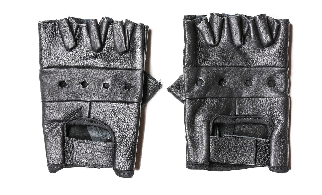 A pair of black genuine leather wrist length fingerless gloves perfect for any Tough Guy look… from costumes to your everyday wardrobe! With holes at the knuckles for ventilation and a Velcro strap for adjustable wear. Made in the U.S.A. by Funk Plus.
