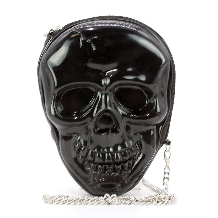 A flexible yet hard moulded plastic black two-sided smiling skull purse with black satin lining, interior pocket and a 28” long silver metal curb link chain crossbody strap. Perfect for a night out and fits all your spooky essentials (including your phone)!