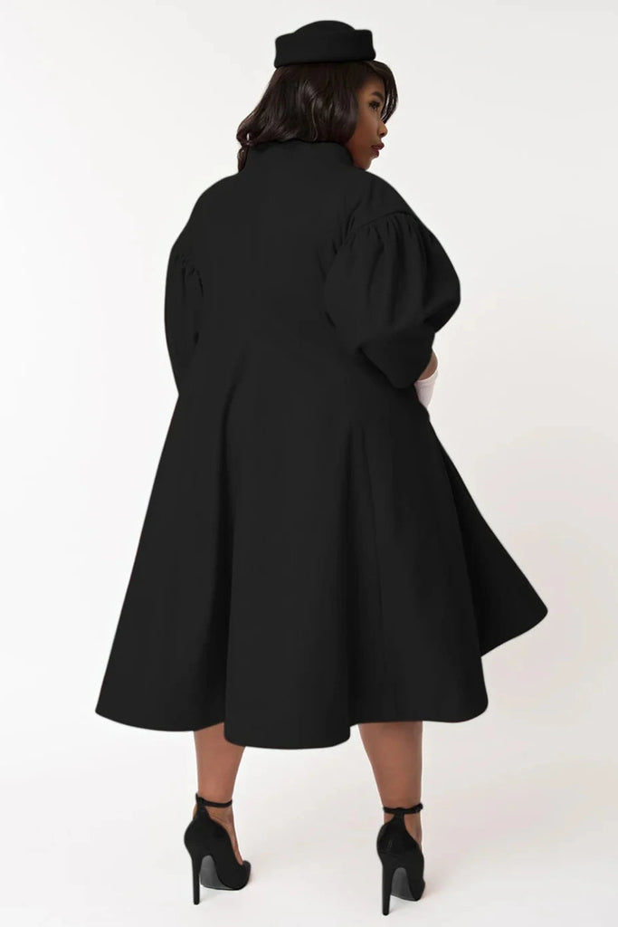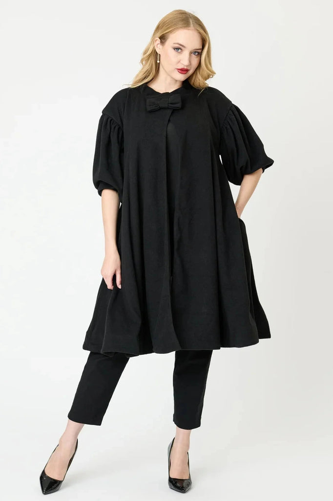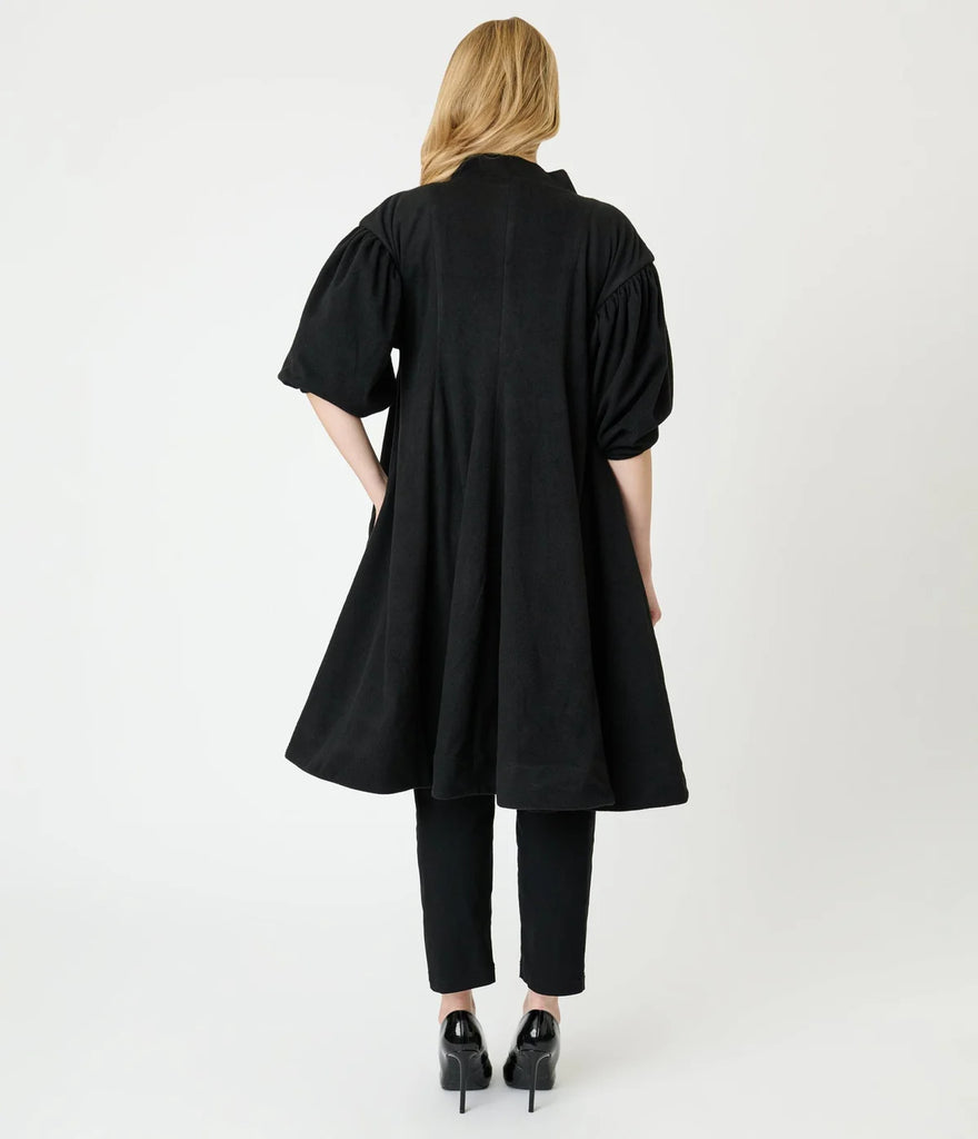 Yay! Finally a classic black version of Unique Vintage's--just like Barbie used to wear--Barbie collaboration bright red swing coat. This 1960s style beauty features a snap closure and bow detail at the neck, sweet puffed 3/4 sleeves to show off fancy gloves or bangles, and side seam pockets