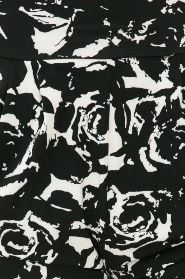 Stretchy buttery-soft brushed fiber knit relaxed fit high waist shorts with elastic waist band, pleated front, ruched side seam detail, and pockets --super comfy, in a bold (and not too sweet!) black & creamy white rose print that's ready to style with casual tees or sassy cropped tops!