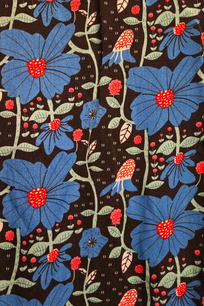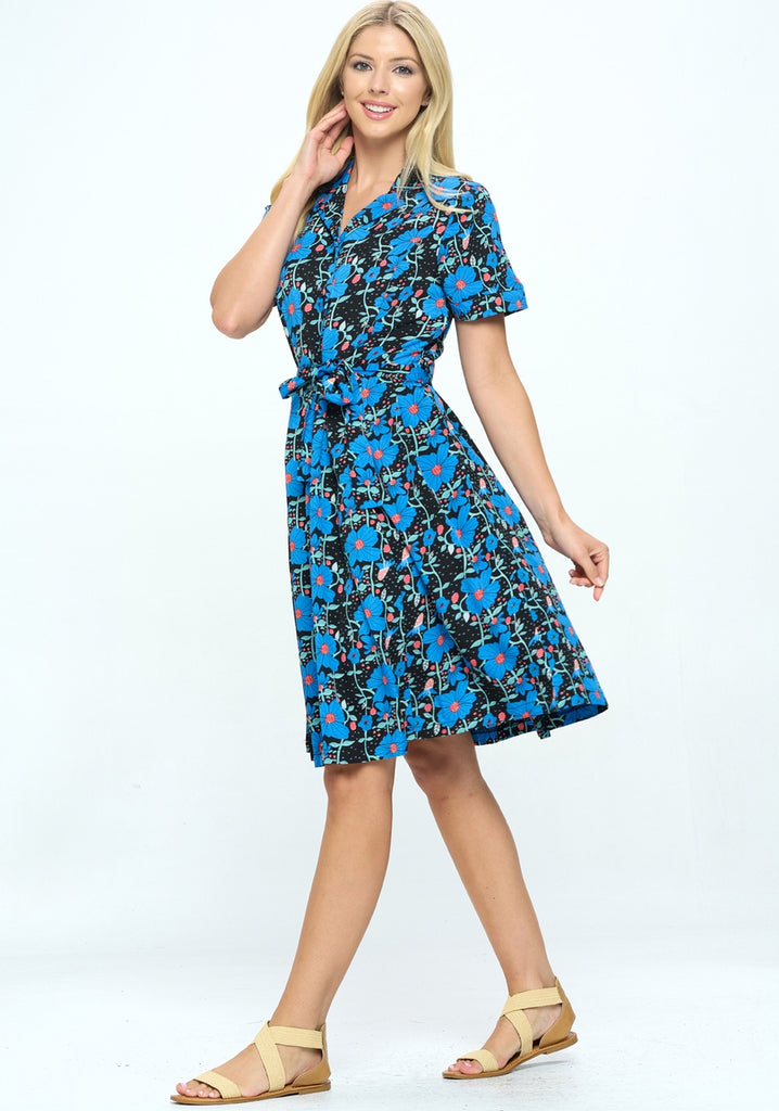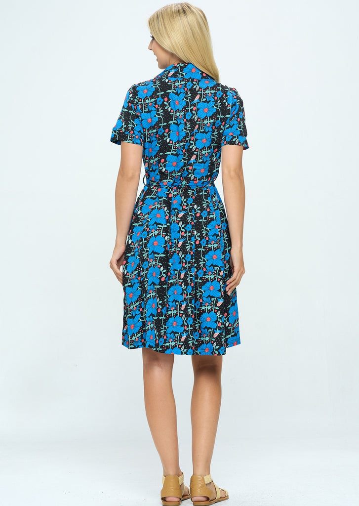 A sweet shirtwaist dress in black with an allover royal blue, red, white, and green floral vertical climbing vine print, featuring a princess seamed bodice with domed shiny black plastic button closure, notched collar v-neckline, short sleeves, a self sash belt, and a just above the knee pleated skirt...AND side seam pockets, yay!