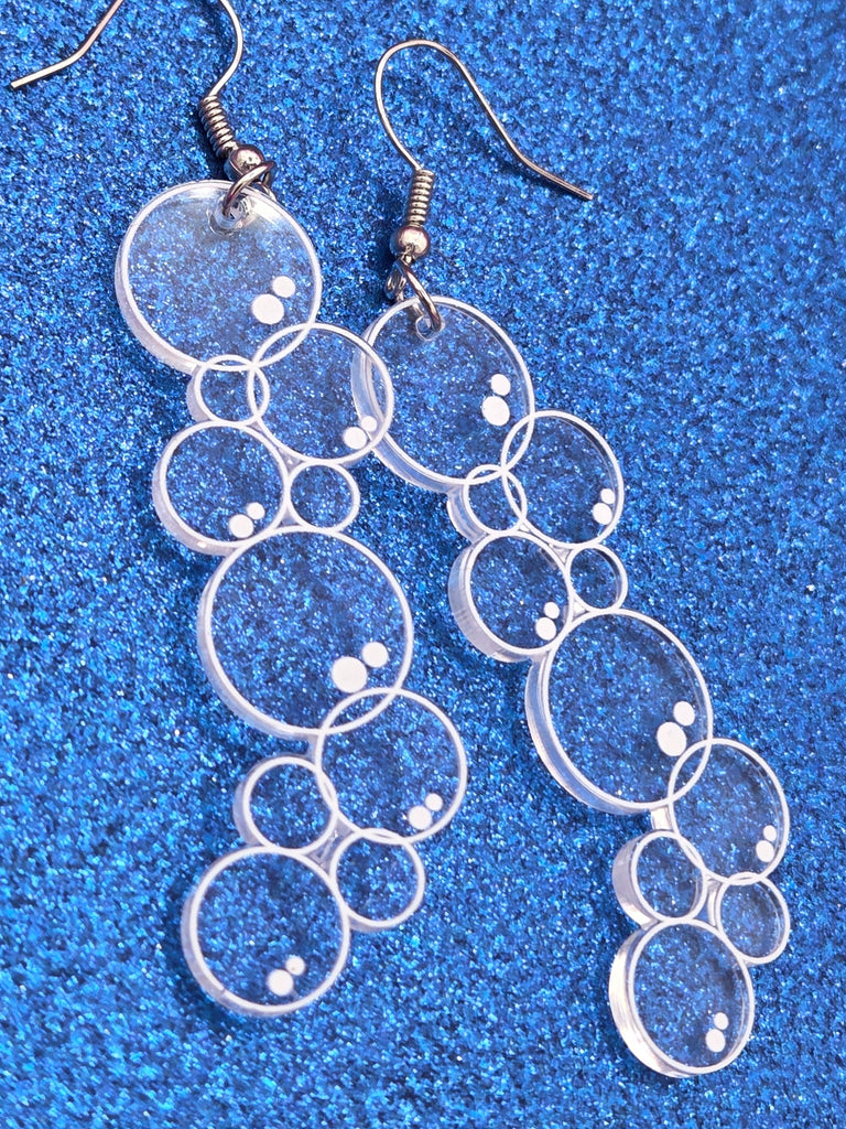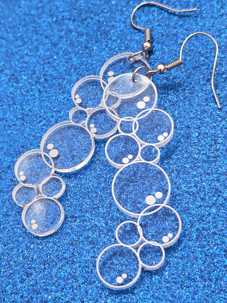 Clear laser-cut acrylic dangle earrings in the shape of a bunch of bubbles with white detail —the perfect light little accessory to make any outfit just a little bubblier!