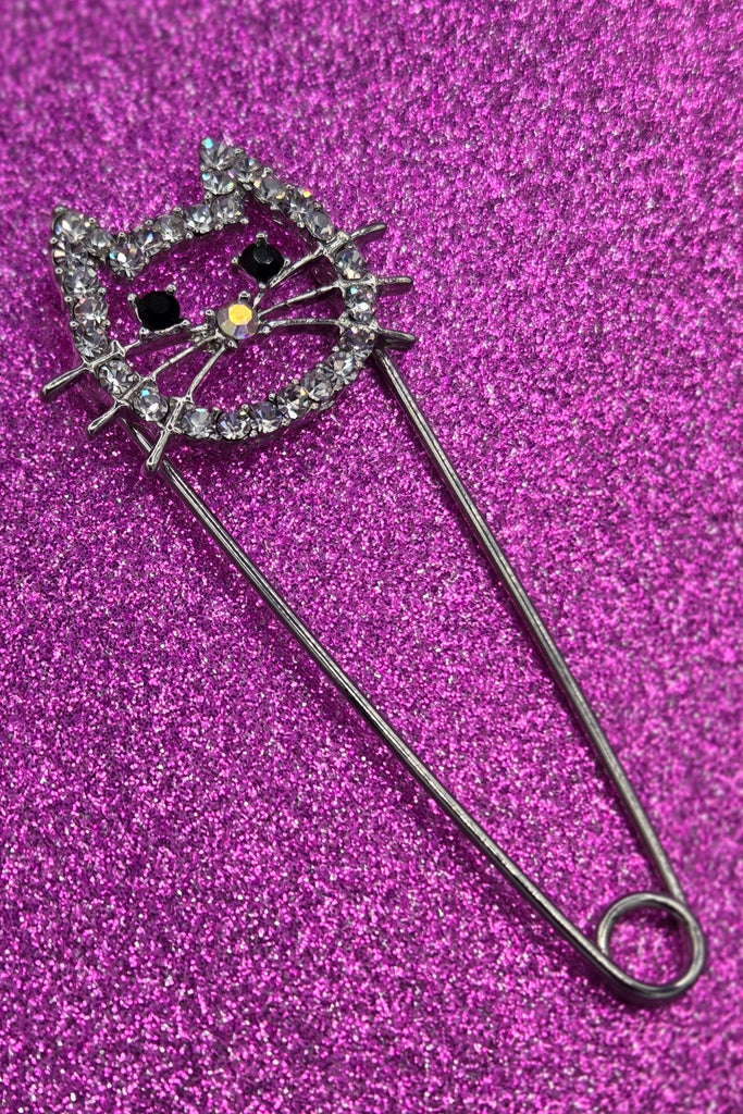 A shiny silver metal oversized safety pin with the cute addition of a cat's head outlined with sparkly clear "rhinestone" jewels, and featuring an iridescent jewel nose and black jewel eyes!
