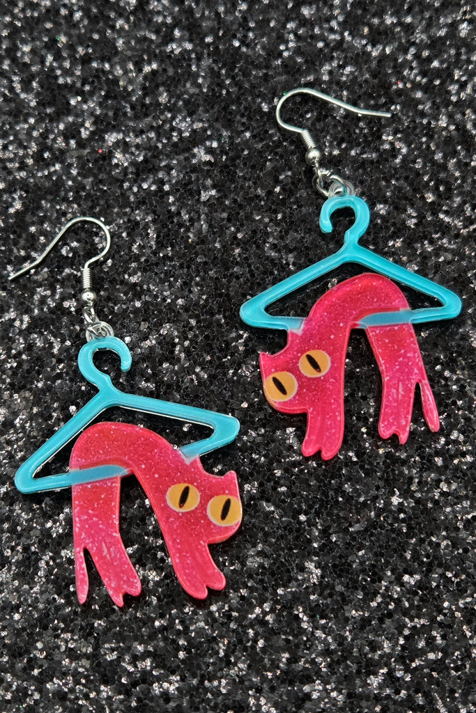 A pair of laser-cut acrylic dangle earrings with a printed image of a neon pink wiggly kitty with giant orange eyes entangled on a blue clothes hanger. So silly!