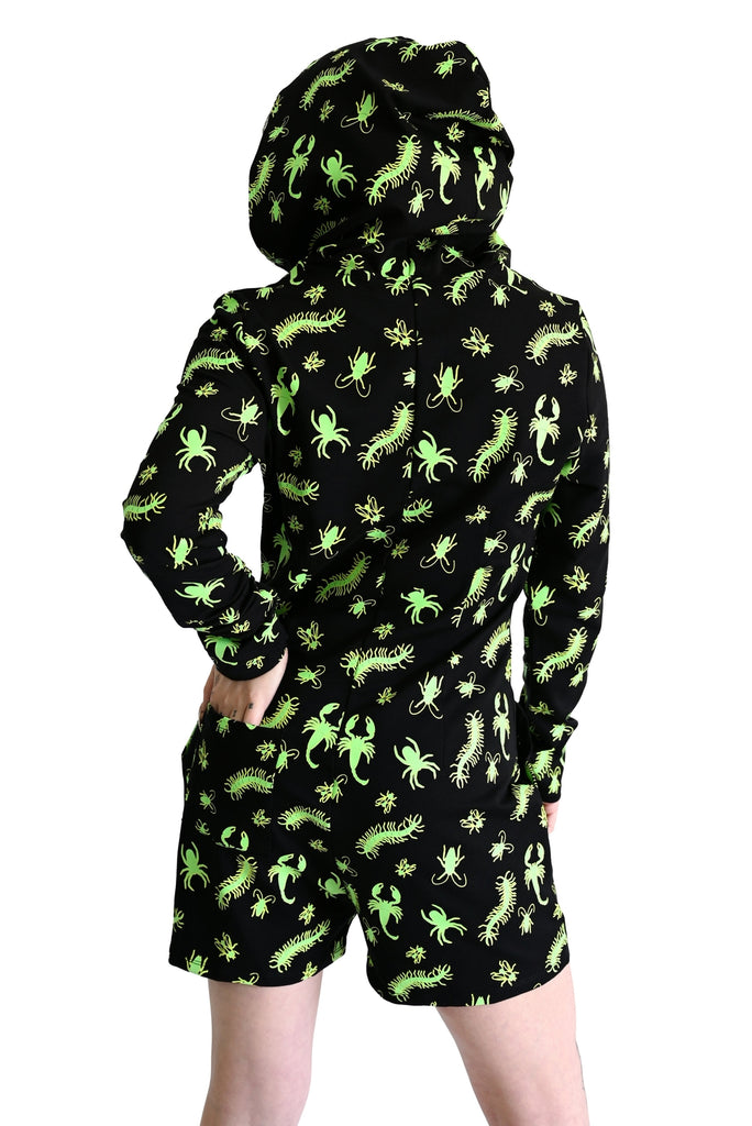The perfect little number to wear for a (horror) movie marathon nestled on the couch is this soft, stretchy, cozy --and INTENSELY glowing-- relaxed fit ribbed knit black romper! In an all-over print of lurid green glow-in-the-dark cockroaches, flies, centipedes, spiders, and scorpions, this one-and-done piece features a hood, comfy long sleeves, a front zip closure, and both patch pockets (yay!) and a back pocket with mid-length shorts. Made by Foxblood.