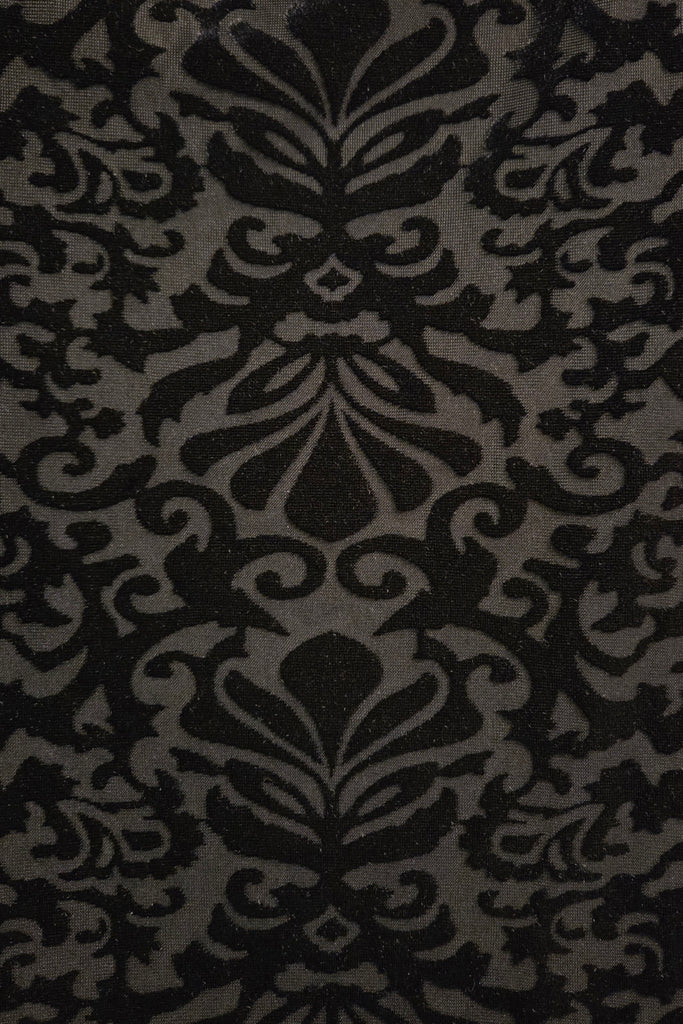 The Dark Solstice dress by The Pretty Cult is a dramatic little number ready for as much Goth glam accessorizing you can throw at it! In stretchy and ultra soft inky black burnout velvet in an ornate damask pattern on a sheer black base, this curve-hugging funnel neck sheath dress has short sleeves and double side slits --perfect for showing off fishnets or your favorite boots.