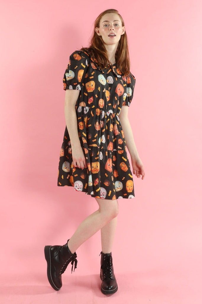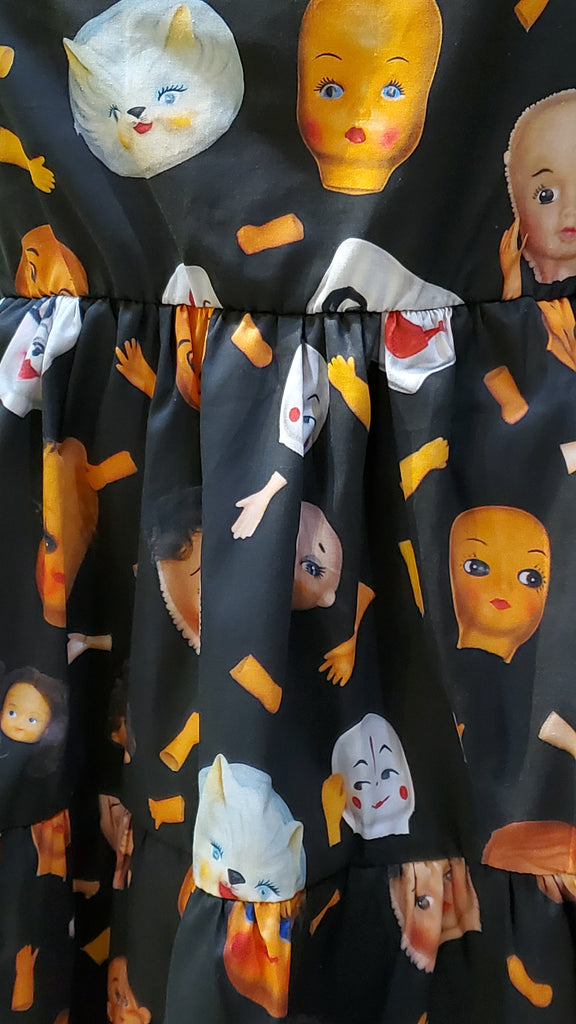 Clothes that are cute, unique, and (a little bit) creepy are some of our main objectives when searching for new clothes for the store... and this dress by Pretty Snake certainly has got our number on all three counts! The Doll Parts babydoll dress has an all over photographic pattern of heads & arms from the doll collection of designer (and Project Runway Season 11 alum!) Joseph Aaron Segal. The slightly oversized fit (for that doll clothing effect) features a ruffled Peter Pan style collar, puffed short sleeves with elasticized hems, an elasticized waistband, a double tiered gathered mini length skirt... and pockets!