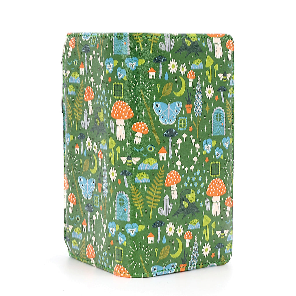 This magically adorable mushroom forest wallet- full of fairy circles, moons, stars, flowers, and even some fairy doors- is ideal for containing your identification, currency, and all the receipts and little slips of paper you collect along the way --this textured faux leather snap closure wallet features a zippered compartment, 3 bill pockets, clear ID slot, and 7 credit card slots.