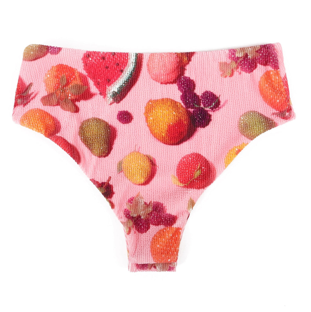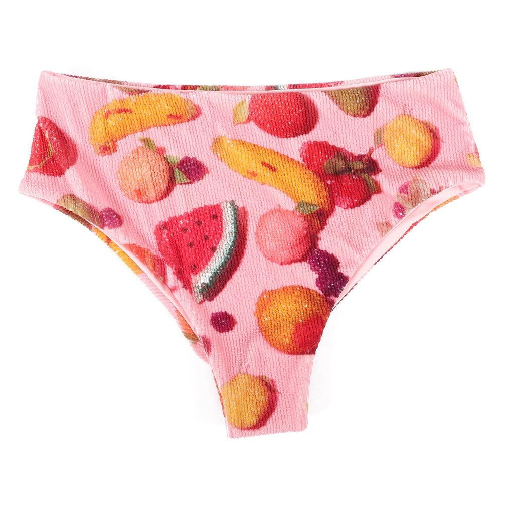 A fresh 'n' fruity retro style mid-rise bikini swim bottom in a dreamy pink background beaded fruit print --watermelons, strawberries, bananas, and more --with a ribbed texture and fully lined! Made by Pretty Snake.