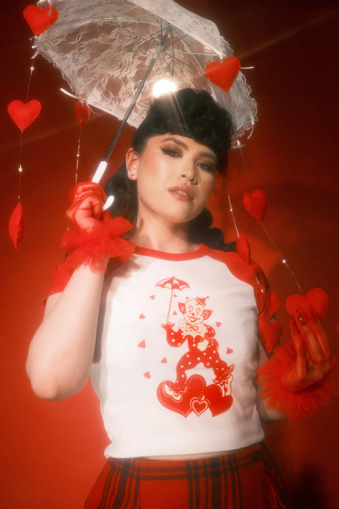A fitted bright white crop t-shirt with red raglan sleeves and a red & cream illustration of a polka-dotted clown holding an umbrella to protect themselves from the deluge of hearts raining down from above! Made in the U.S.A. by Mischief Made.