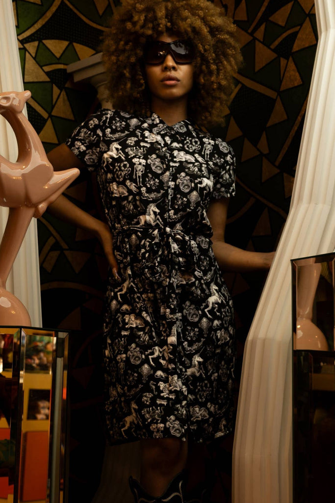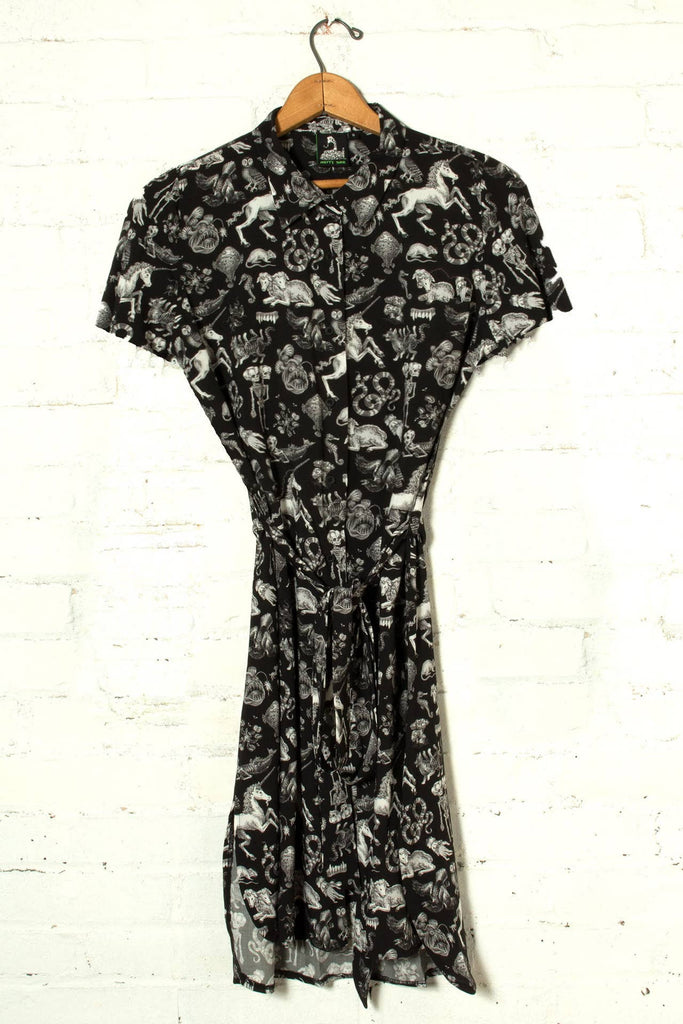 A light and breezy day dress in a classic silhouette with a not-so-ordinary print for all the Summer Goths made by Pretty Snake --featuring a pattern with original art by Julian Farmar-Bowers chock-full of natural oddities and creatures... two-headed lambs, unicorns, rats, deep sea creatures, Fiji mermaids, snakes, 8-legged cats, and venus flytraps among other things! This shirtwaist style dress features short sleeves, a self sash belt, knee-length skirt, and side seam pockets. Dress up or down with platform sandals or heels for an easily polished look that doesn't sacrifice your personality!