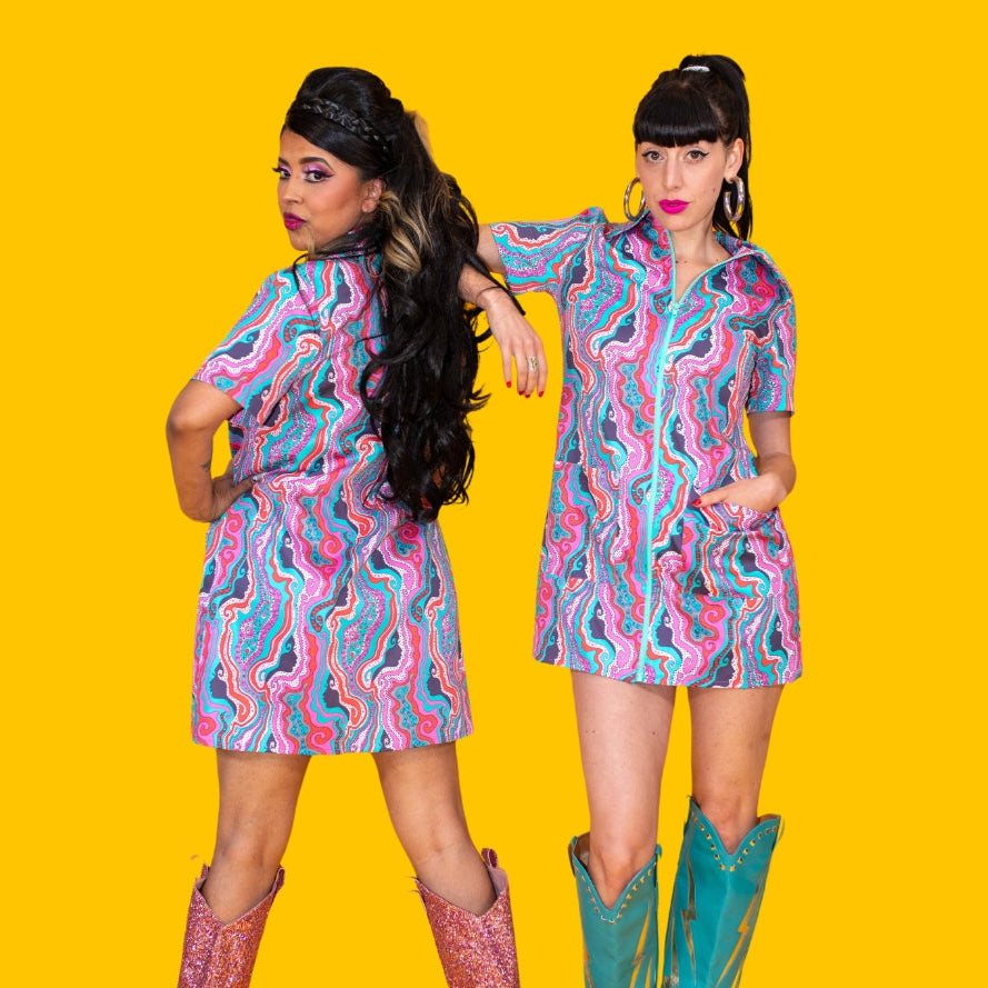 This super fun mini dress by Blue Platypus has a psychedelic multicolored print full of faces in silhouette, lips, eyes, tiny blue platypuses (of course!), stars, eggs, and more, in a colorway of groovy tones of pink, red, and aqua blue! The short sleeve dress is made of a light cotton with just a touch of stretch for comfort and features a bright blue plastic zipper down the length of the front, a wide collar, and two matching patch pockets at each hip. The options for accessorizing are endless--just pick and mix any of the colors in the dress with a stack of bangles or a bright pair of tights or knee-high socks!