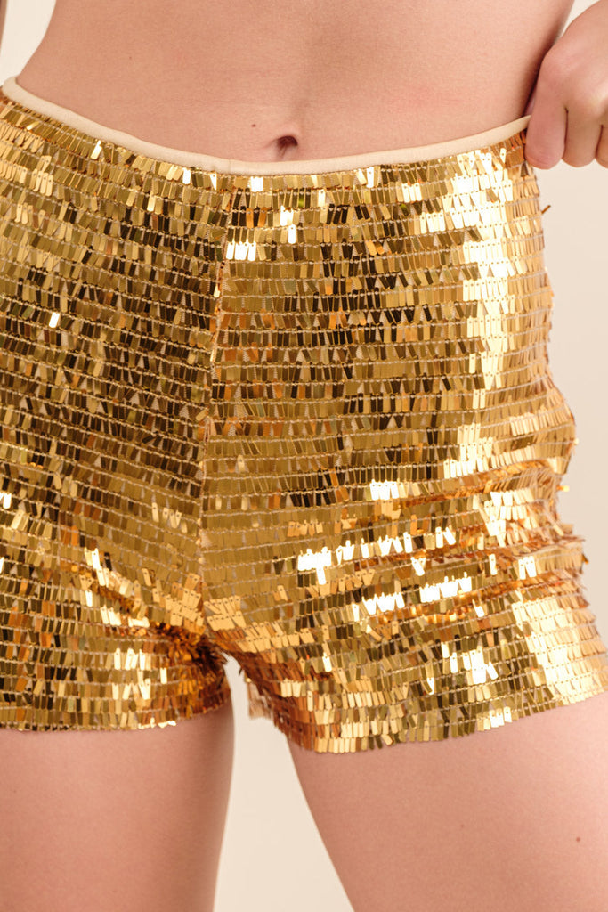 Super shiny high-waisted hot pants covered in rows of metallic gold rectangular sequins. The perfect pair of shorts to channel your inner Poison Ivy...guitar chops not included!