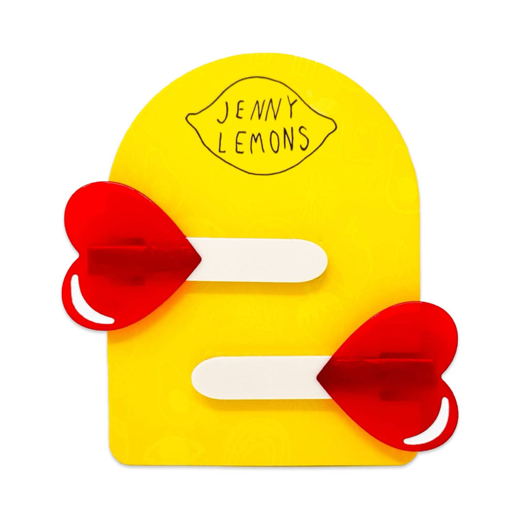 A pair of semi-translucent red cellulose acetate (a plant-based alternative to plastic) hair clips with hand-painted detail in the shape of a couple of heart-shaped lollipops --a sweet (not sticky) way to keep your hair out of your face! Made by Jenny Lemons.