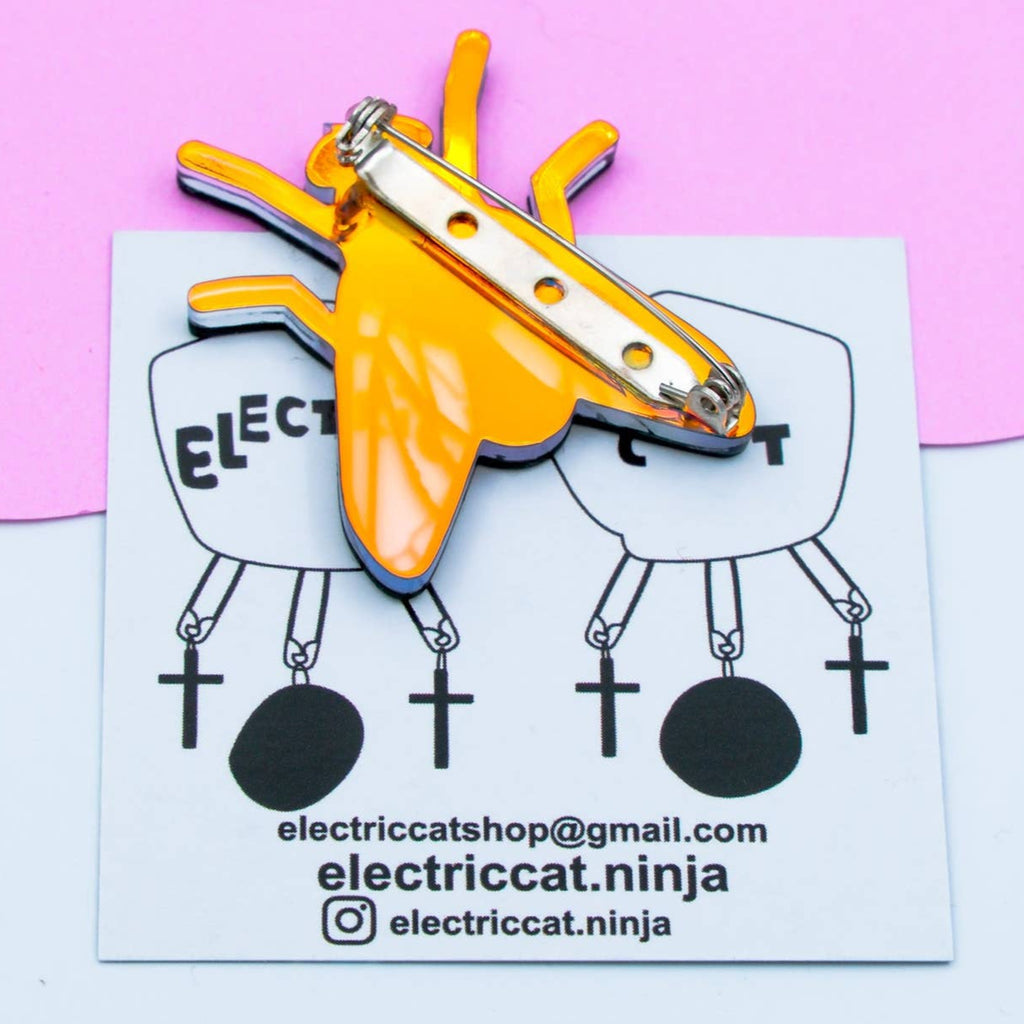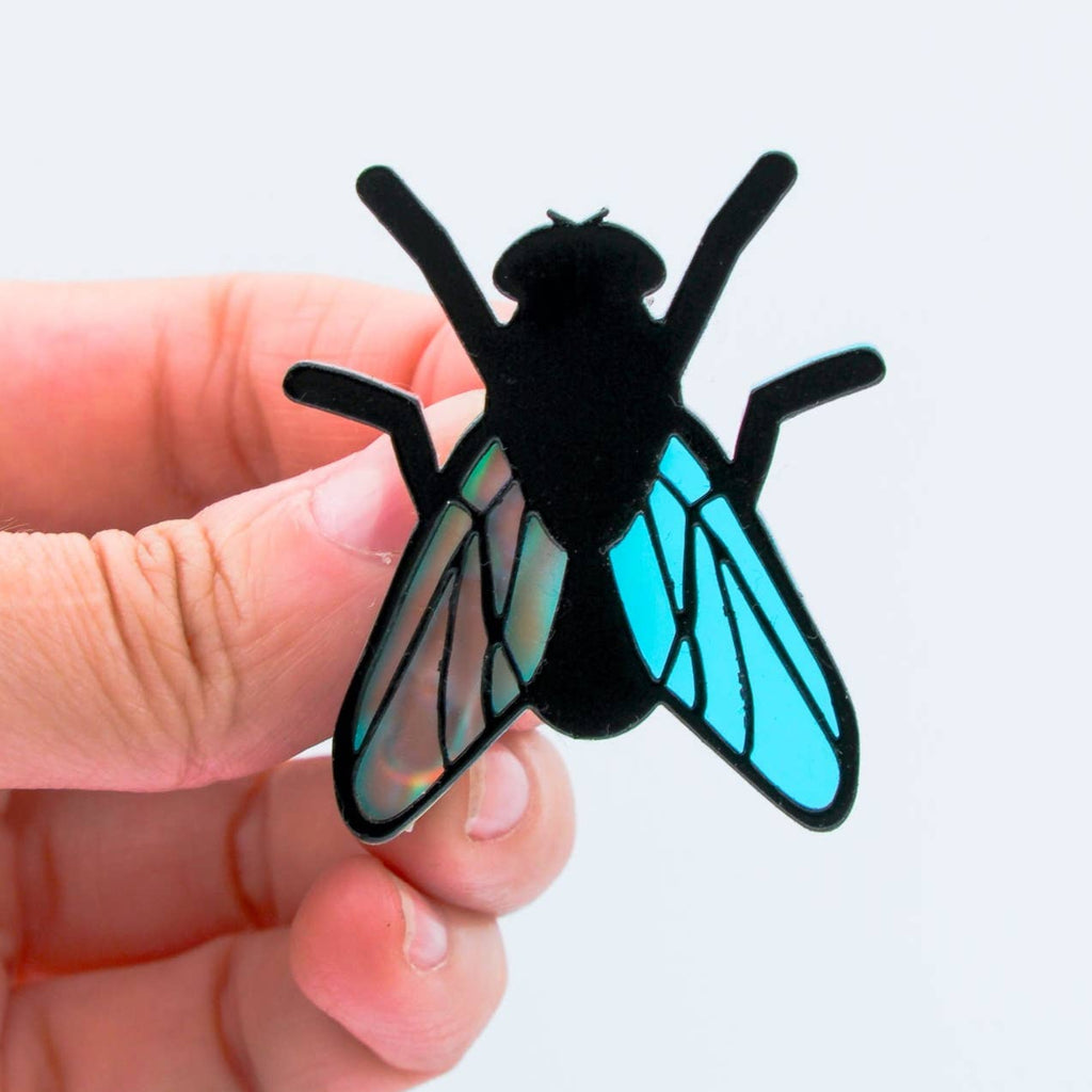 Cause a buzz with this shiny layered black acrylic fly brooch with matte finish translucent iridescent wings! Made in the U.S.A. by Electric Cat.