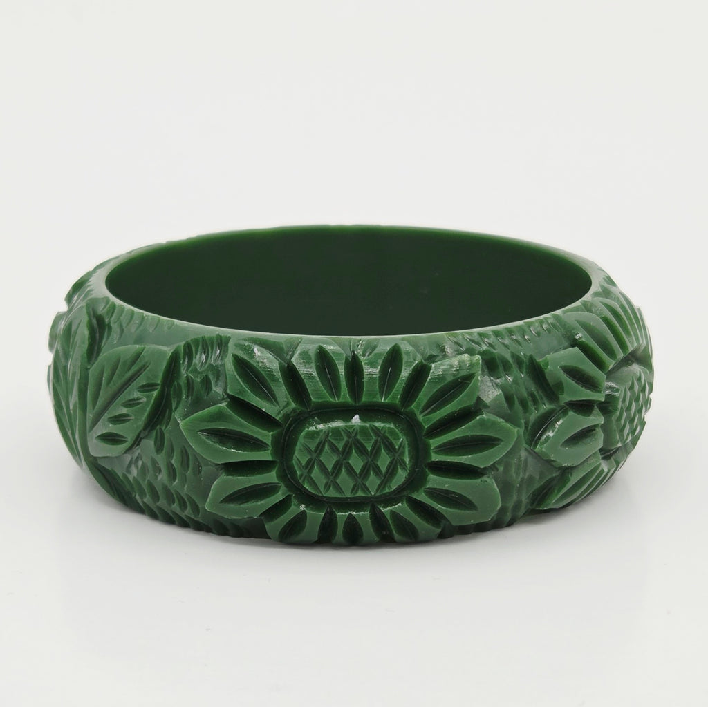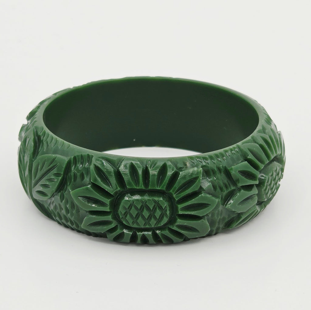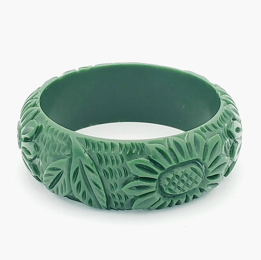 The Jacquard Bangle in Pine by Lucky Lou Shoes- rich dark green fakelite” resin (meant to mimic Bakelite) with an intricately carved sunflower & leaf motif! A gorgeous vintage-inspired addition to your daily bangle stack.