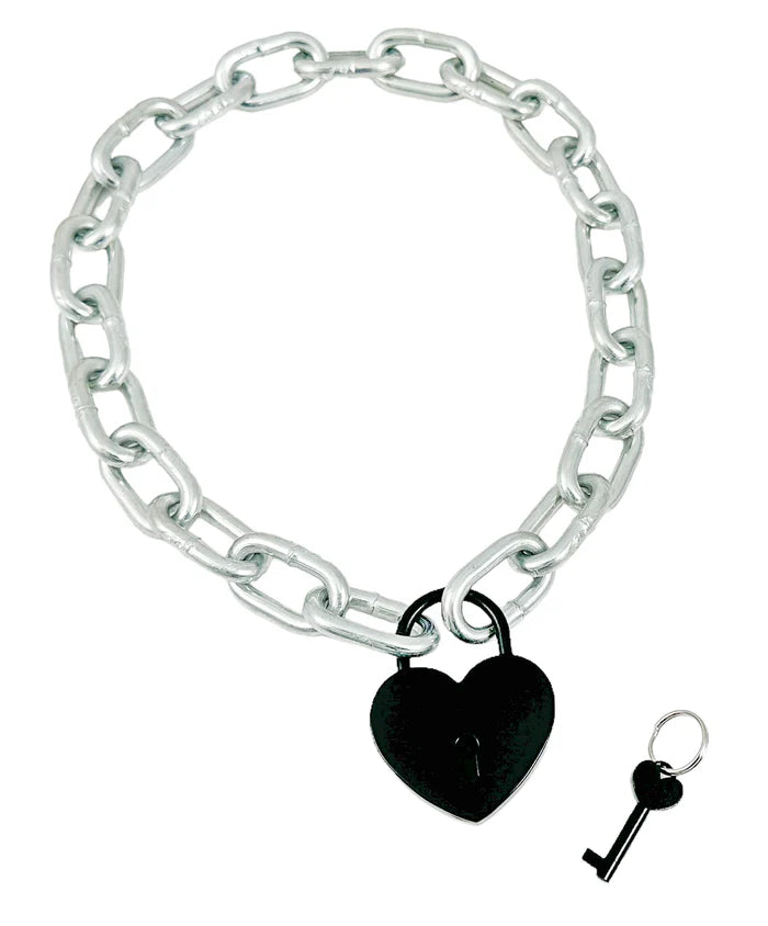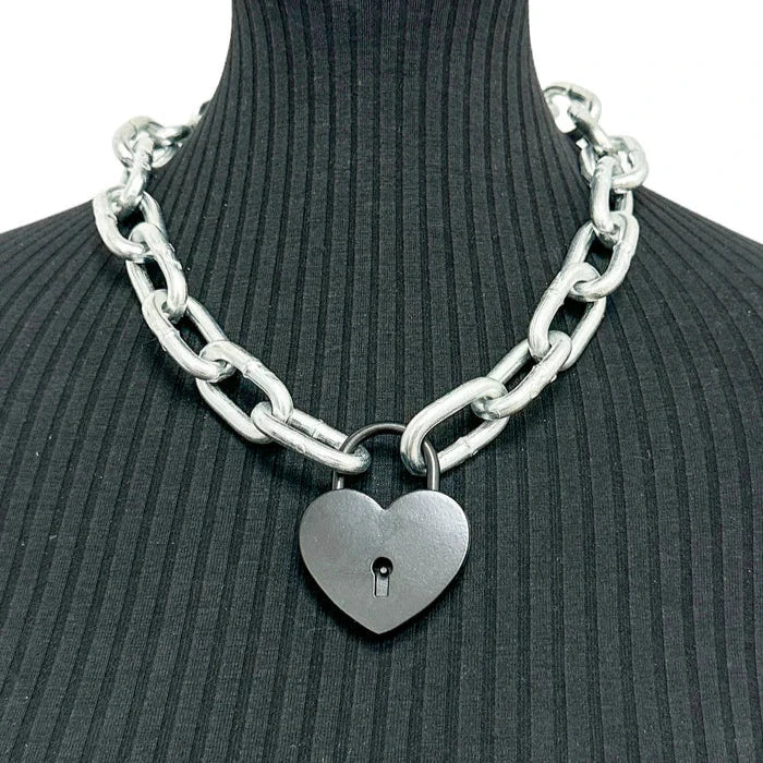An extra heavy-duty 21” silver metal link chain with a 1 3/4” black heart-shaped padlock in a satin finish! Comes with a working heart-shaped key attached to a silver metal split key ring- use the key to open and close the padlock and put it around your neck (and put the key ring on your keychain for safekeeping)! Made in the U.S.A. by Funk Plus.