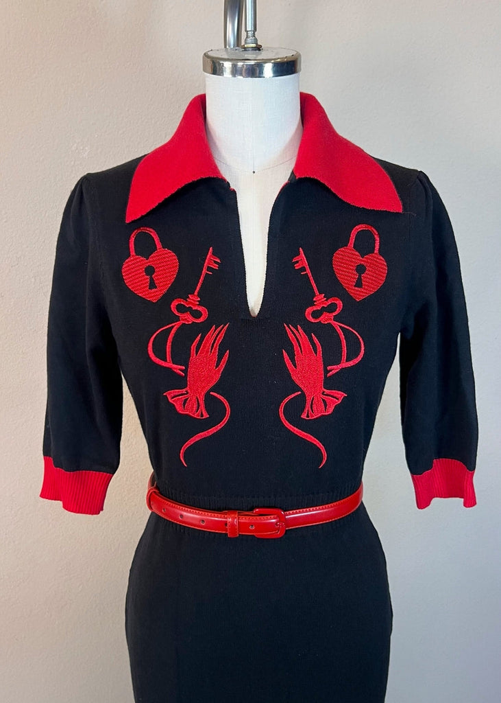From the MurderQueen X Elle Rebel Collab Collection comes the Key to My Heart sweater dress, a vintage-inspired femme fatale fit worthy of any deadly dame! Made of soft and stretchy medium weight knit acrylic (think your favorite cardigan) to hug your curves and give you structure in all the right places, it features a shallow v-neckline with bright red rolled collar, a ribbed waistband, elbow length sleeves with red cuffs and original illustrations by Larissa Pinup Art of a trio of romantic symbols --a heart-shaped lock, a key, and a gloved hand --embroidered in bright red across the bodice! It ends with a universally flattering pencil skirt with side slit for ease of wear (and a little bit of va-va-voom, of course)! Pair with your favorite heels and some fishnets for a sultry look ripped from the pages of a pulp novel.
