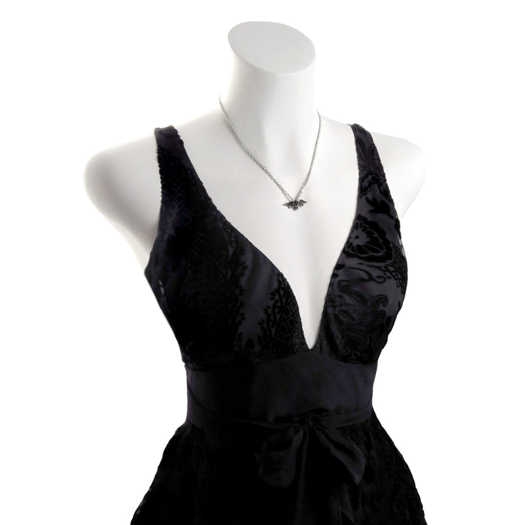 A delicate antiqued Fine English Pewter hanging bat pendant with outstretched wings on an 18" silver lead-free metal link chain, made by Alchemy of England.