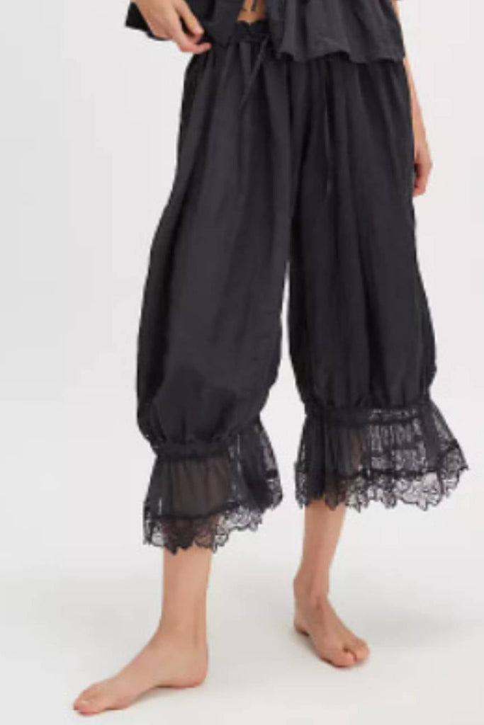 A comfortable and flowy separate for warm weather wear --these relaxed fit bloomer-style cropped pants have a simple elastic waistband with functional drawstring tie and gathered pantaloon cuffs with a ruffled floral lace trim. Perfect paired with a crop top and a pair of flats for a touch of summer Goth maximalism without sacrificing the ability to stay cool!
