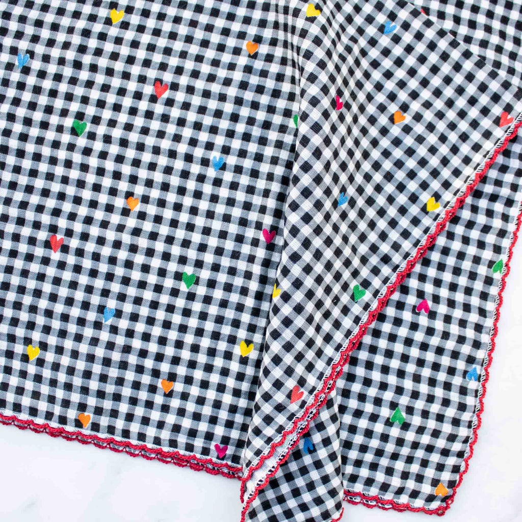 Sweet vintage-inspired seersucker cotton scarf in a black and white gingham pattern with allover dainty rainbow heart print, finished with deep red embroidered scallop trim --perfectly pretty tied in your hair or around your neck.