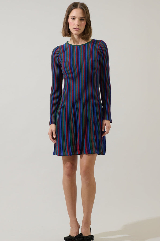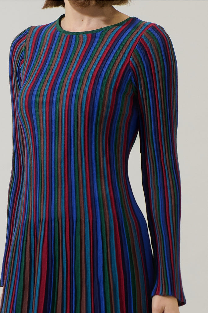 A fantastic ribbed knit sweater dress in vertical stripes of gorgeous earth and jewel tones in a sassy mini length with a flared skirt, simple rounded neckline, and long sleeves with slightly flared cuffs --throw on some opaque tights (classic black or any of the colors in the stripes for an extra pop of color!) for a put together yet cozy fit.