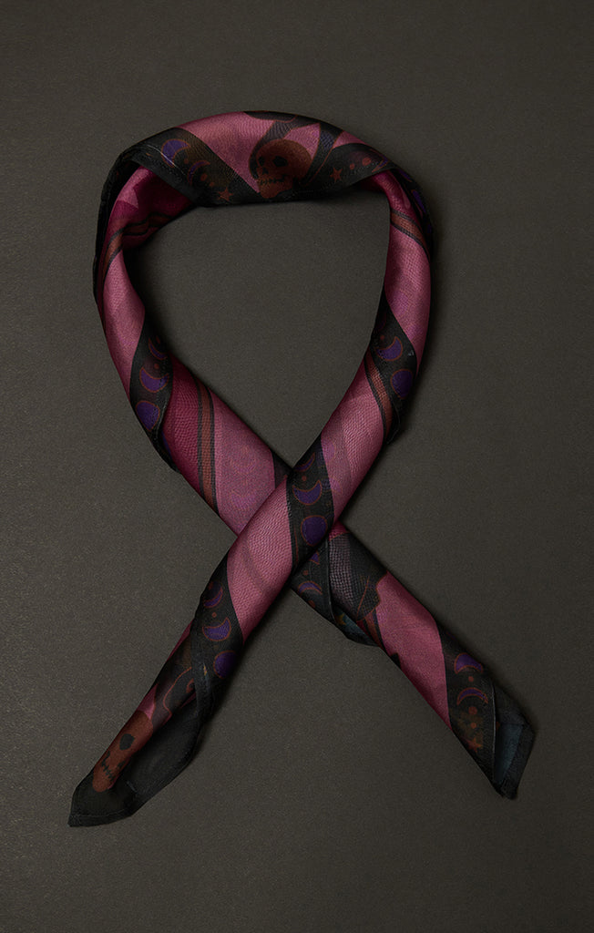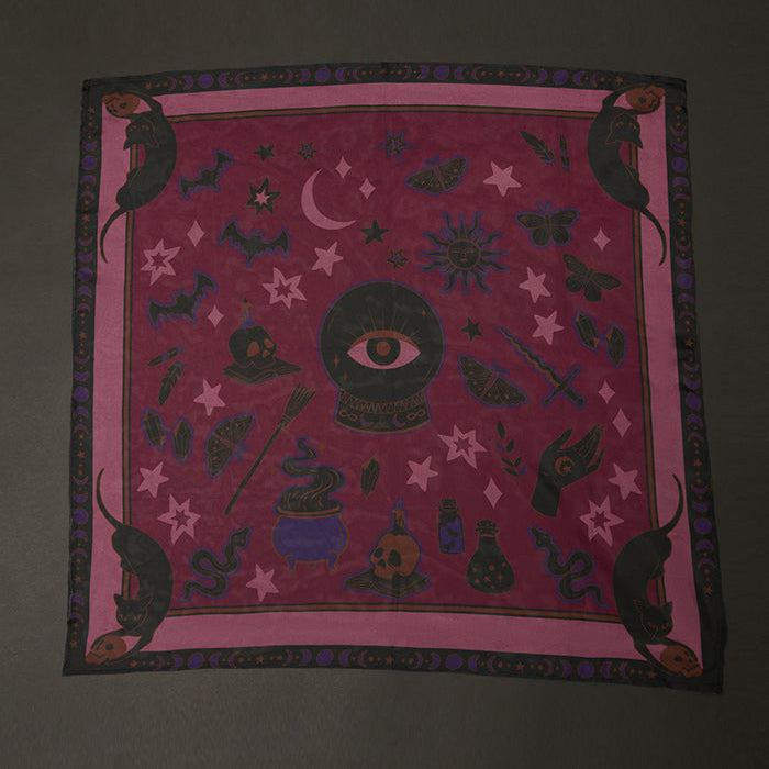 Vintage inspired semi-sheer black and purple chiffon square scarf with an all-over motif of moons, stars, cats, snakes, potions, and other mystical icons. Made by Unique Vintage.