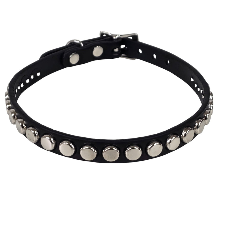 Classic thick leather 1/2” wide adjustable black leather collar with 1 row of 3/8” silver round flat head studs and a heavy duty silver metal buckle. This stiff and sturdy choker will break in nicely and last for years. Made in the U.S.A. by Funk Plus.