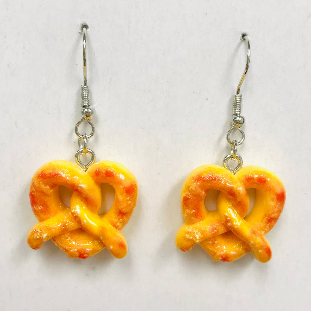 A pair of molded acrylic dangle earrings in the shape of golden hot pretzels for a delicious (visual) feast!