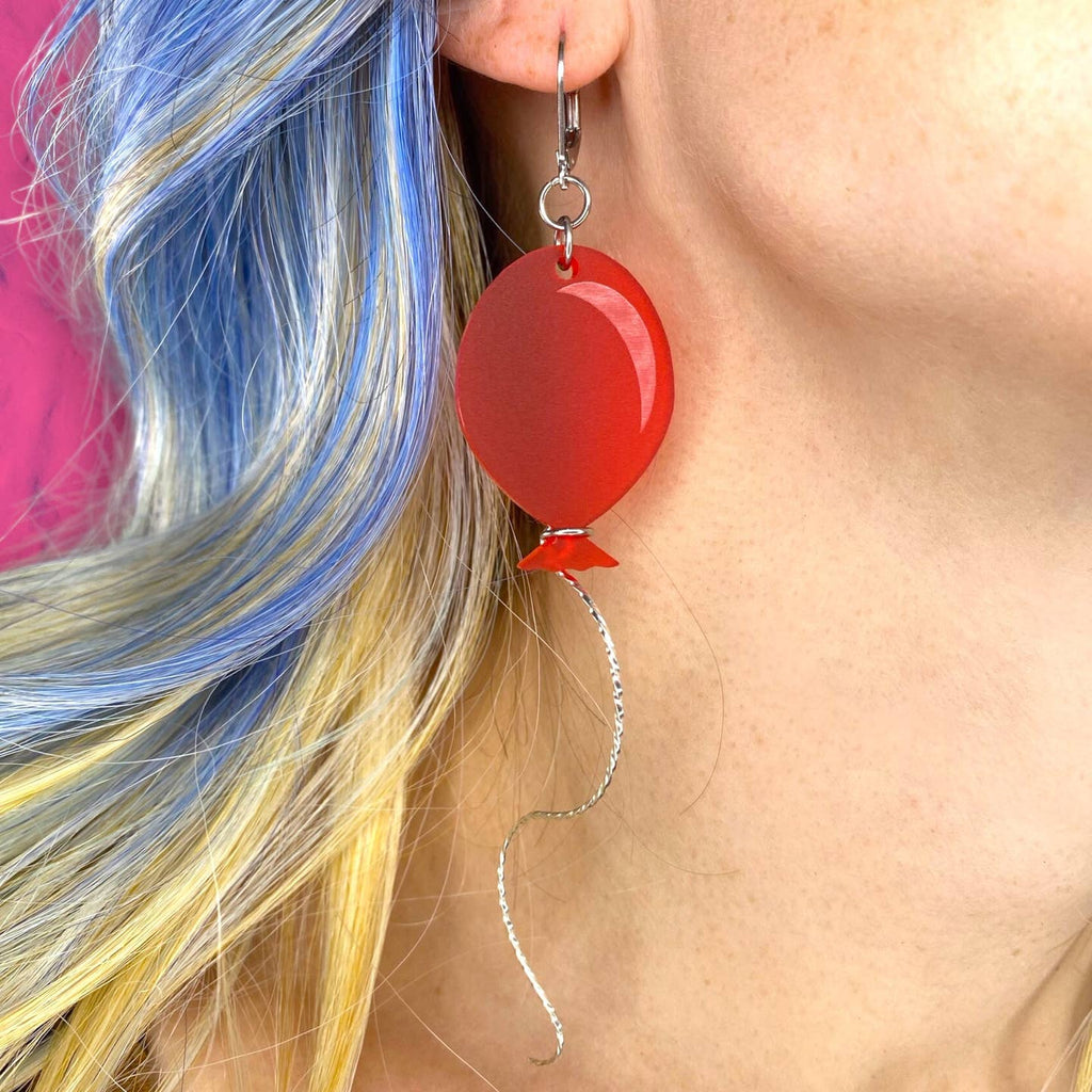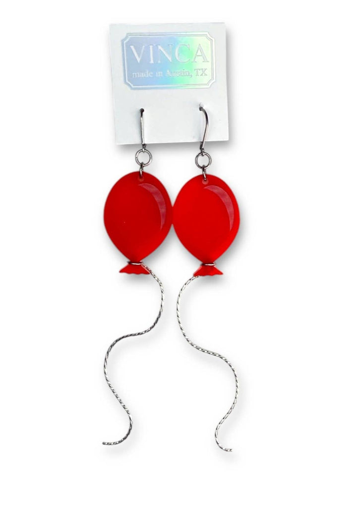 Everyone loves balloons --whether they conjure visions of a day at the fair OR a scary clown hiding in the sewers! Choose which mood you decide to bring to this fun finishing touch for any outfit... frosted laser-cut acrylic red balloon dangle earrings with wavy sterling silver "string"! Made in the U.S.A. by Vinca.