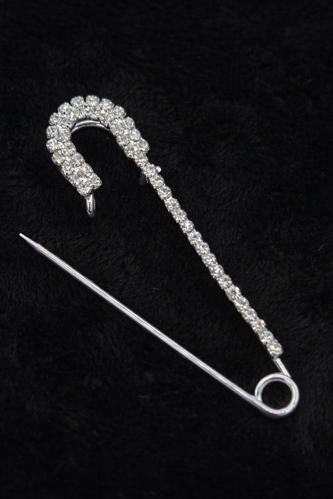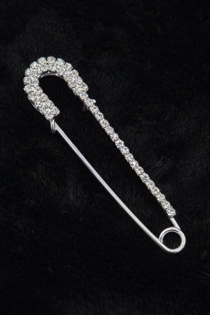A shiny silver metal oversized safety pin with the glam addition of some clear "rhinestone" jewels!