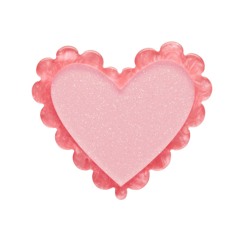 Valentines Collection "Scalloped Heart" pink glitter resin simplified mini brooch, designed in Australia by Erstwilder.