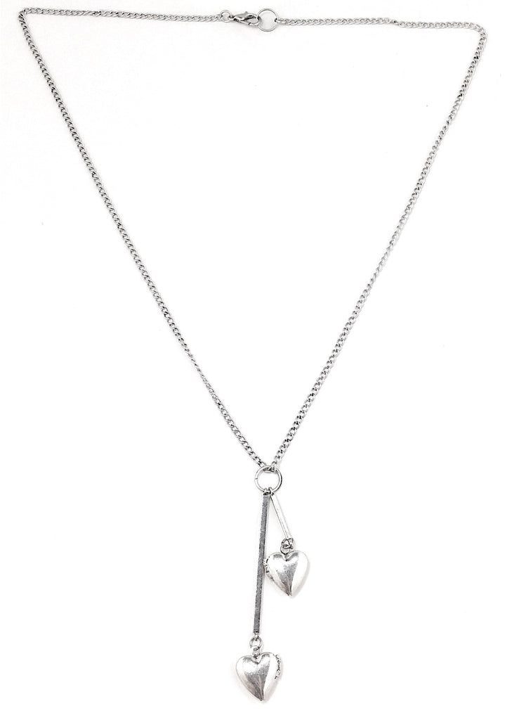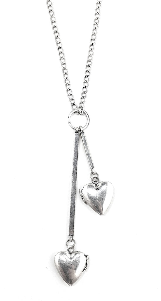A 21" silver metal chain link style necklace with a pair of puffy metal heart-shaped lockets connected by a large jump ring.