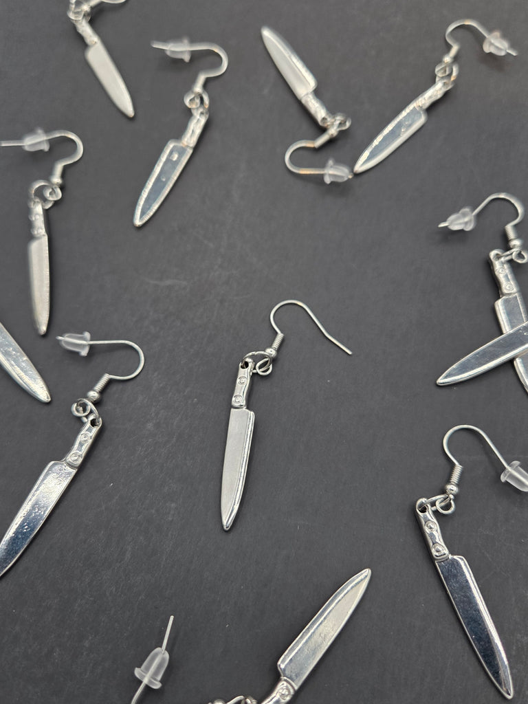 Single tiny chef's knife dangle earring in silver metal --shiny, delicate, and just a little bit stabby!