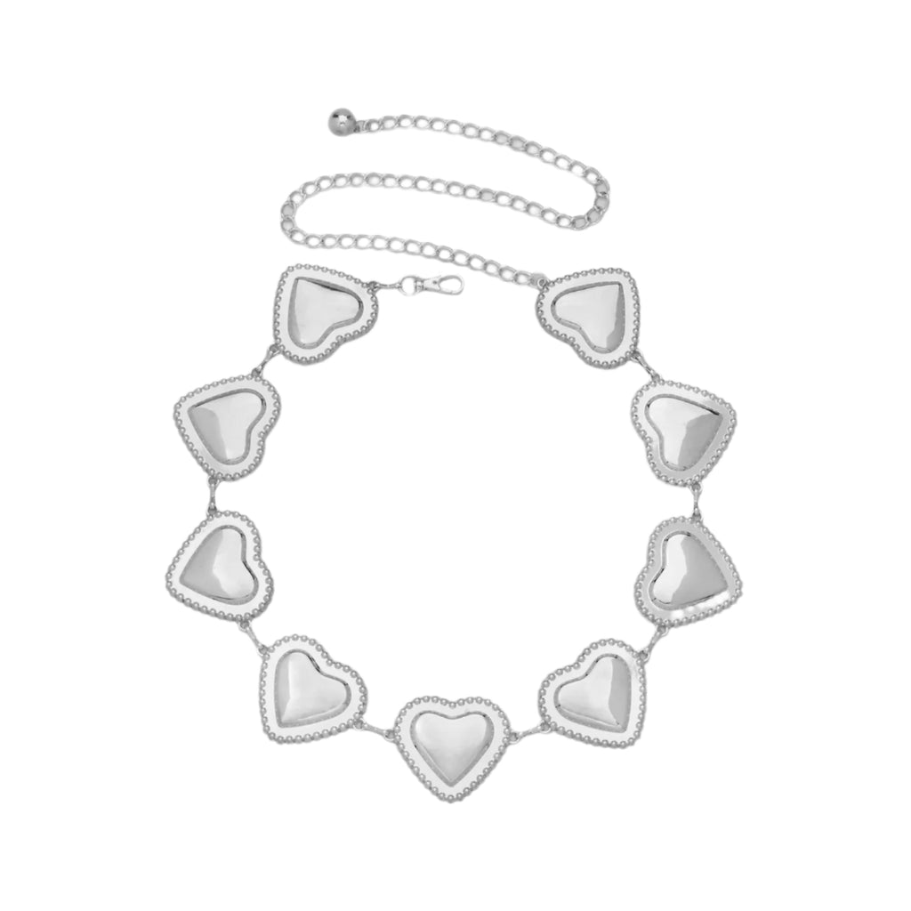 Adjustable belt of linked 2” puffy hearts in shiny silver metal with link chain extender and sturdy lobster claw fastener. Whether worn at the waist or low on the hips, this versatile style is great for accessorizing retro or modern outfits!