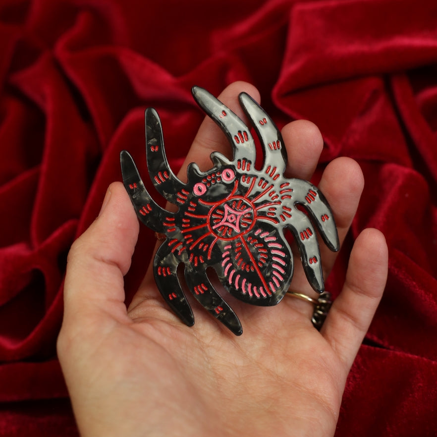 A black marbled acetate hair clip in the shape of a spooky spider with pink and red details --let an eight-legged furry friend help you keep your 'do together! Made in the U.S.A. by Hellcats USA.