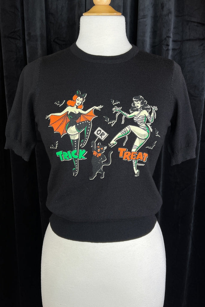 This cozy sweater by Mischief Made features a pair of femme fatales --one in a bat costume and the other wrapped up like a mummy --out on the prowl trick-or-treating! Printed on a classic black crew neck short sleeved pullover sweater by Mak --one we’ve carried in the store for years! Reminiscent of the classic 50’s “sweater girl” styles. Printed in the U.S.A. by Mischief Made.