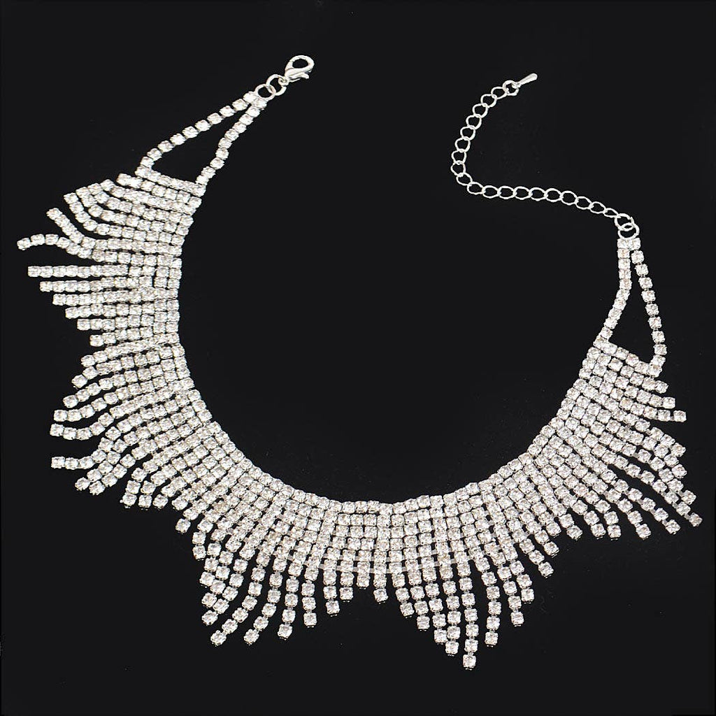 A fancy Art Deco-inspired collar (or choker) style necklace comprised of five triangles of varying lengths of sparkly clear square cut "rhinestone" jewels set in shiny silver metal!