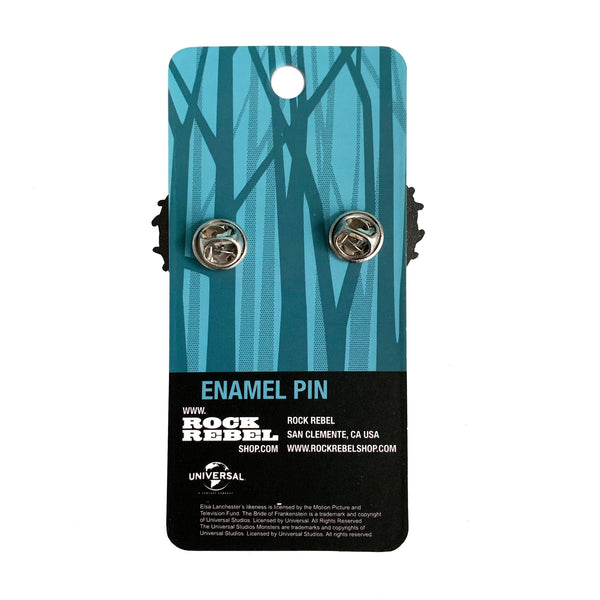 Glow-in-the-dark barbed wire trimmed black heart enamel pin depicting the iconic "We Belong Dead" profile poses of Boris Karloff as the monster and Elsa Lanchester as his mate from the classic 1935 movie, Bride of Frankenstein