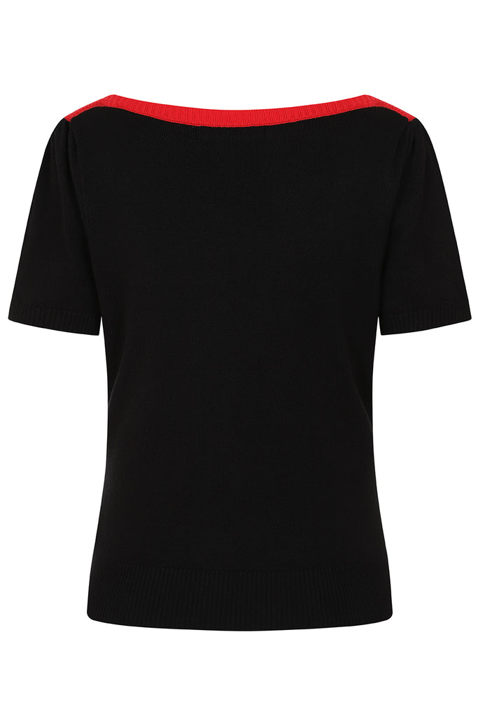 The Winona sweater by Banned Apparel is a super soft pullover slash neck sweater with slightly puffed short sleeves in classic black with lipstick red trim. Across its chest is a panel of creamy off-white separated by a row of horizontal black and cream diamond shapes finished with a sweet matching red tiny heart dotted inside — pair this with a full skirt to dress up or high-waisted jeans to dress down for a vintage-inspired outfit sure to create some heart eyes!