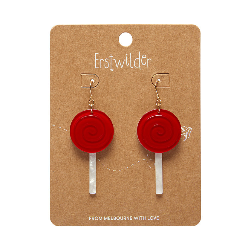 Wonka Essentials Collection lollypop dangle earrings in rich red 100% Acrylic resin, designed in Australia by Erstwilder.